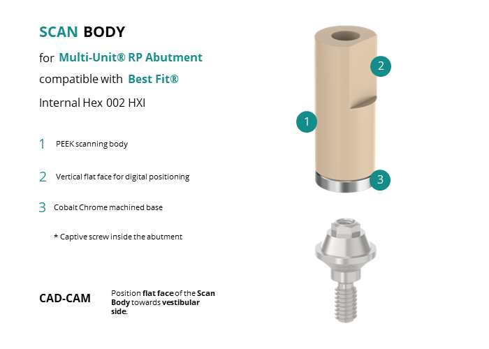 - CAD-CAM: Position flat face of the Scan Body towards vestibular side.