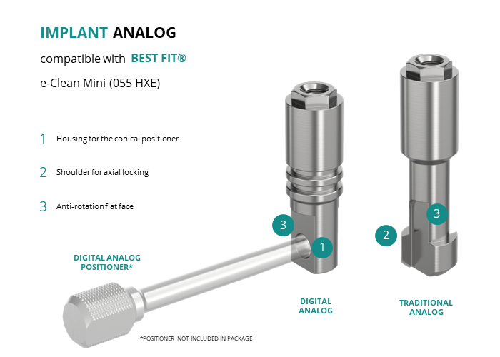 The GT-Medical analog compatible with the Best Fit® e-Clean Mini (055 HXE) implant line is made of Stainless Steel, has a diameter of 3.5mm, and accurately replicates the connection of this Best Fit® implant.