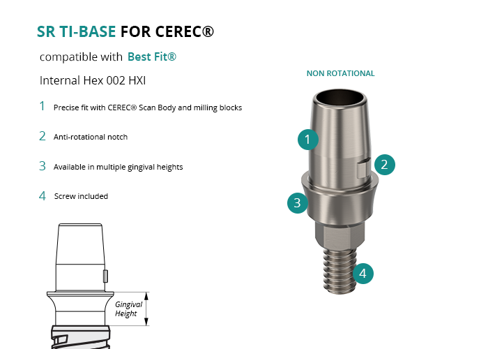 SR Titanium Base for CEREC® compatible with Best Fit® Internal Hex 002 HXI