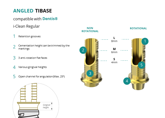 GT-Medical's Angled Ti-Base are compatible with i-Clean Regular implants from Dentis®, ensuring a stable and long-lasting connection between the implant and the prosthesis, while also allowing angulations to be corrected up to 25 degrees. They are made entirely of Titanium Grade 5 with a yellow anodizing for a more aesthetic finish. They have a cementation trunk that can be cut to various heights with an open channel to allow angulation, 3 flat faces to perform the anti-rotating function and a gingival body of various heights, depending on the type of connection.