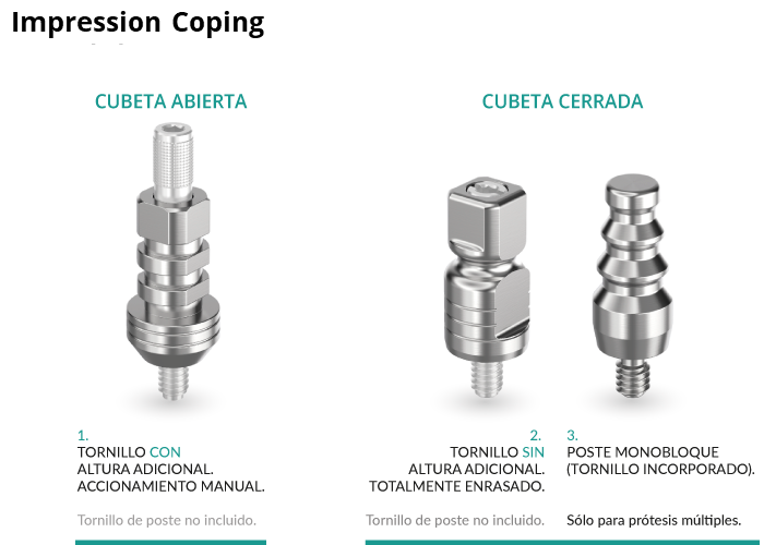 Depending on the design of the Impression Coping, it can be used for open tray or closed tray impression techniques, by selecting the corresponding screw.