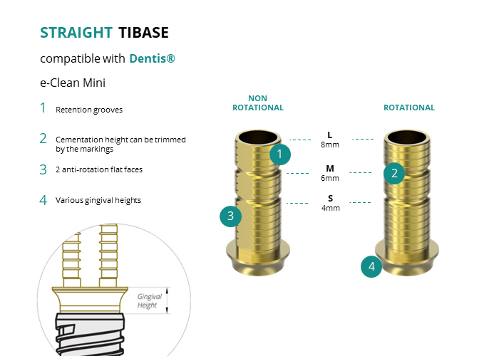 GT-Medical's Ti-Base are compatible with e-Clean Mini implants from Dentis®, allowing a stable and long-lasting connection between the implant and the prosthesis. They are made entirely of Titanium Grade 5 with a yellow anodized for a more aesthetic finish. They have a cementation trunk that can be cut to various heights, 2 flat faces to perform the anti-rotating function and a gingival body of various heights, depending on the type of connection.