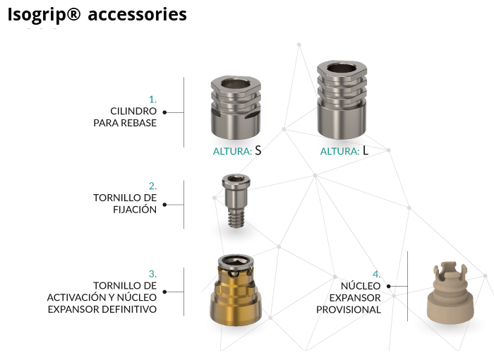 - Titanium piece that attaches the IsoGrip® System to the overdenture, exerting a slight pressure until a "Click" is felt.