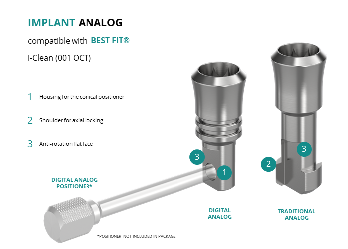 - Digital Analog: for models made of resin through 3D printing, locking is achieved using a slightly conical positioner, ensuring axial positioning.
