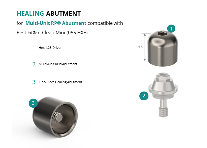 - One-piece healing abutment for easy placement, no extra screws needed.