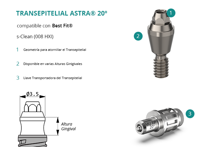 El Transepitelial Astra® 20º de GT-Medical es compatible con los implantes s-Clean (008 HXI) de Best Fit®, proporcionando una conexión duradera y estable para restauraciones múltiples. Tiene un diámetro de 3.5mm, y está fabricado en Titanio de Grado 5, garantiza una alta resistencia, biocompatibilidad y durabilidad en las restauraciones sobre implantes. Su diseño incluye varias alturas gingivales, lo que facilita la adaptación en diferentes perfiles de tejidos blandos y garantiza una estética óptima.