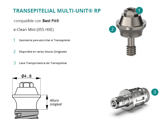 El Transepitelial Multi-Unit® RP de GT-Medical es compatible con los implantes e-Clean Mini (055 HXE) de Best Fit®, proporcionando una conexión duradera y estable para restauraciones múltiples. Tiene un diámetro de 4.8mm, y está fabricado en Titanio de Grado 5, garantiza una alta resistencia, biocompatibilidad y durabilidad en las restauraciones sobre implantes. Su diseño incluye varias alturas gingivales, lo que facilita la adaptación en diferentes perfiles de tejidos blandos y garantiza una estética óptima.