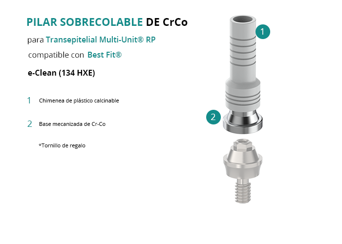 El Pilar Calcinable con Base de Cr-Co de GT-Medical es compatible con la línea de implantes e-Clean (134 HXE) de la marca Best Fit®, proporciona una base sólida para la estructura protésica y garantiza un ajuste óptimo con el Transepitelial Multi-Unit® RP. Está formado por una base mecanizada de Cromo Cobalto y una chimenea de plástico calcinable.