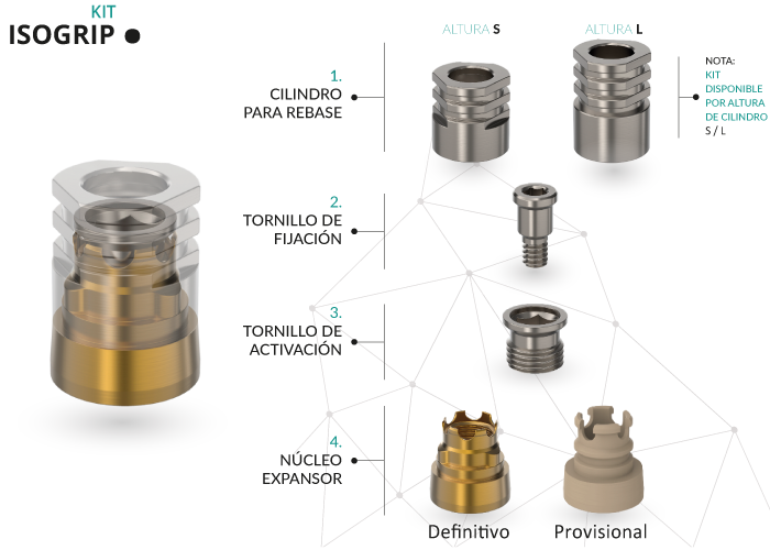 El Kit Isogrip está compuesto por varias piezas, fabricadas en Titanio de grado 5 con acabado micro pulido a espejo para evitar la adhesión de placa bacteriana y en PEEK para uso biomédico.