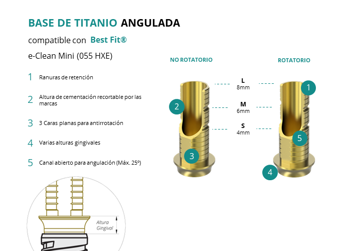 Las Ti-Base Anguladas de GT-Medical son compatibles con los implantes e-Clean Mini (055 HXE) de Best Fit®, facilitando una conexión estable y duradera entre el implante y la prótesis, y permitiendo corregir angulaciones de hasta 25 grados. Están compuestas en su totalidad por Titanio de Grado 5 con un anodizado dorado para un acabado más estético. Poseen un tronco de cementación recortable a varias alturas con canal abierto para permitir angulación, 3 caras planas para realizar la función antirotativa y un cuerpo gingival de varias alturas, dependiendo del tipo de conexión.