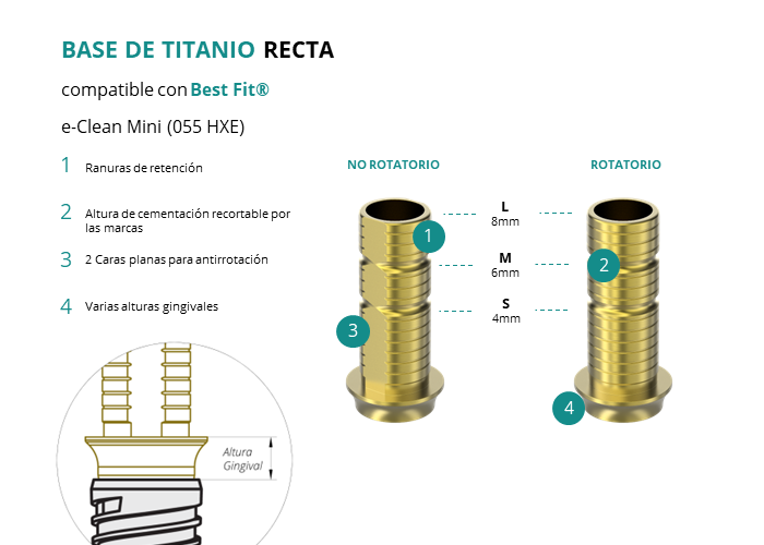 Las Ti-Base Rectas de GT-Medical son compatibles con los implantes e-Clean Mini (055 HXE) de Best Fit®, permitiendo una conexión estable y duradera entre el implante y la prótesis. Están compuestas en su totalidad por Titanio de Grado 5 con un anodizado dorado para un acabado más estético. Poseen un tronco de cementación recortable a varias alturas, 2 caras planas para realizar la función antirotativa y un cuerpo gingival de varias alturas, dependiendo del tipo de conexión.