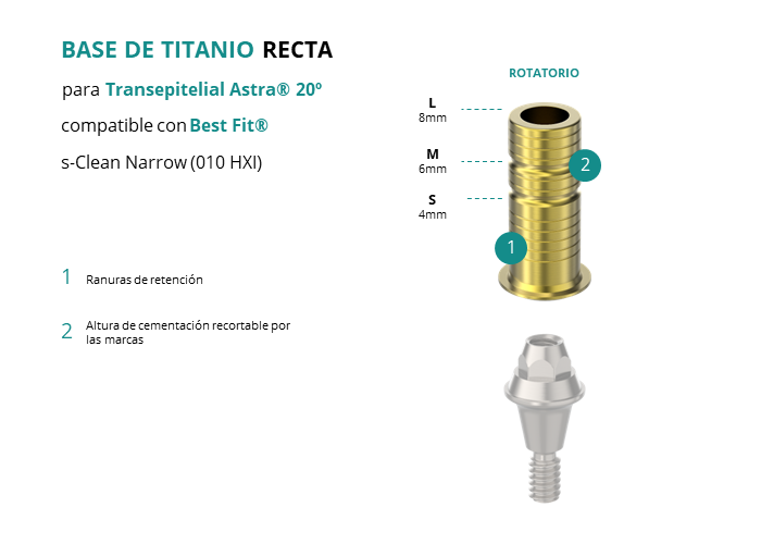 Las Ti-Base Rectas de GT-Medical son compatibles con los implantes s-Clean Narrow (010 HXI) de Best Fit®, permitiendo una conexión estable y duradera entre el Transepitelial Astra® 20º y la prótesis. Están compuestas en su totalidad por Titanio de Grado 5 con un anodizado dorado para un acabado más estético. Poseen un tronco de cementación ranurado y recortable a varias alturas.