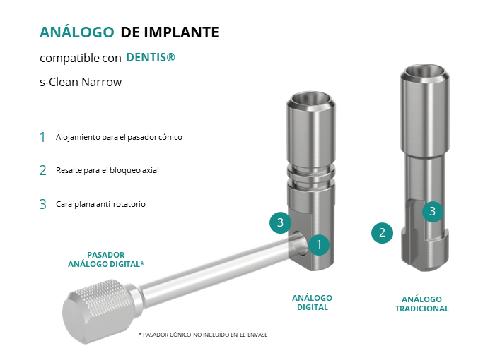 El análogo de GT-Medical compatible con la línea de implantes s-Clean Narrow de la marca Dentis®, está fabricado en Acero Inoxidable, tiene un diámetro de 3.0mm, y replica con exactitud la conexión de este implante de Dentis®.