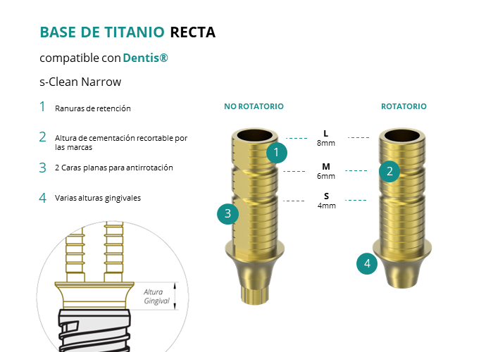 Las Ti-Base Rectas de GT-Medical son compatibles con los implantes s-Clean Narrow de Dentis®, permitiendo una conexión estable y duradera entre el implante y la prótesis. Están compuestas en su totalidad por Titanio de Grado 5 con un anodizado dorado para un acabado más estético. Poseen un tronco de cementación recortable a varias alturas, 2 caras planas para realizar la función antirotativa y un cuerpo gingival de varias alturas, dependiendo del tipo de conexión.