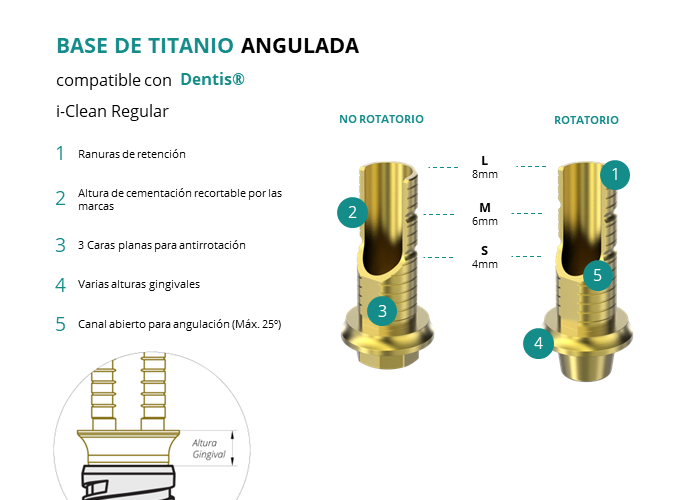 Las Ti-Base Anguladas de GT-Medical son compatibles con los implantes i-Clean Regular de Dentis®, facilitando una conexión estable y duradera entre el implante y la prótesis, y permitiendo corregir angulaciones de hasta 25 grados. Están compuestas en su totalidad por Titanio de Grado 5 con un anodizado dorado para un acabado más estético. Poseen un tronco de cementación recortable a varias alturas con canal abierto para permitir angulación, 3 caras planas para realizar la función antirotativa y un cuerpo gingival de varias alturas, dependiendo del tipo de conexión.