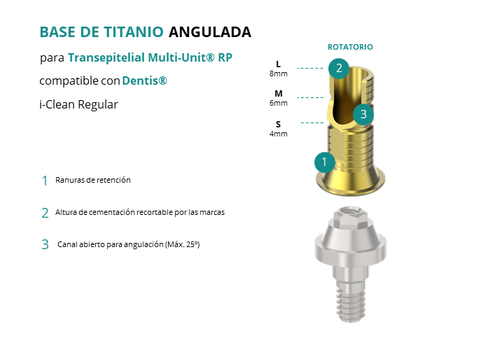 Las Ti-Base Anguladas de GT-Medical son compatibles con los implantes i-Clean Regular de Dentis®, lo que asegura una conexión estable y duradera entre el Transepitelial Multi-Unit® RP y la prótesis, permitiendo además corregir angulaciones de hasta 25 grados. Están compuestas en su totalidad por Titanio de Grado 5 con un anodizado dorado para un acabado más estético. Poseen un tronco de cementación ranurado y recortable a varias alturas.