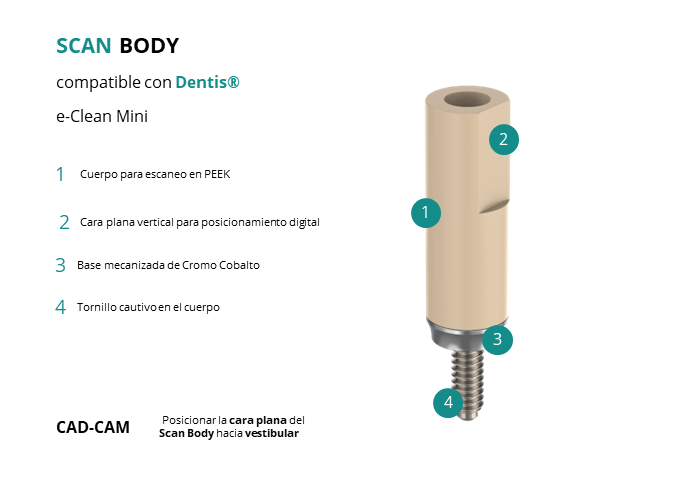 - CAD-CAM: Posicionar la cara plana del Scan Body hacia vestibular.