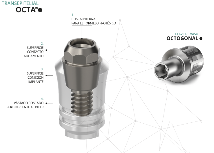 El Transepitelial Octa® es un aditamento fabricado por Gt-Medical en Titanio de grado 5 con acabado micro pulido a espejo para evitar la adhesión de placa bacteriana.