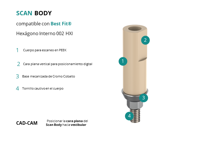 - CAD-CAM: Posicionar la cara plana del Scan Body hacia vestibular.
