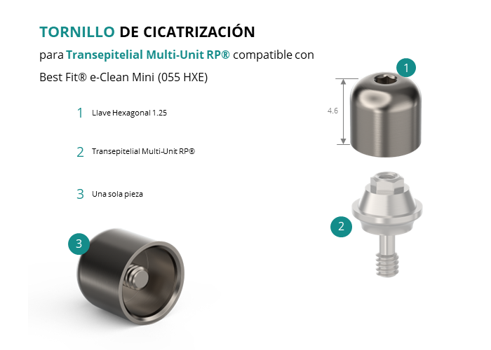 GT-Medical ofrece un Tornillo de Cicatrización para el Transepitelial Multi-Unit® RP (tipo Nobel®) compatible con la línea de implantes e-Clean Mini (055 HXE) de la marca Best Fit®, está fabricado en Titanio Grado 5, tiene un diámetro de 4.8mm, y una altura total de 4.6mm.